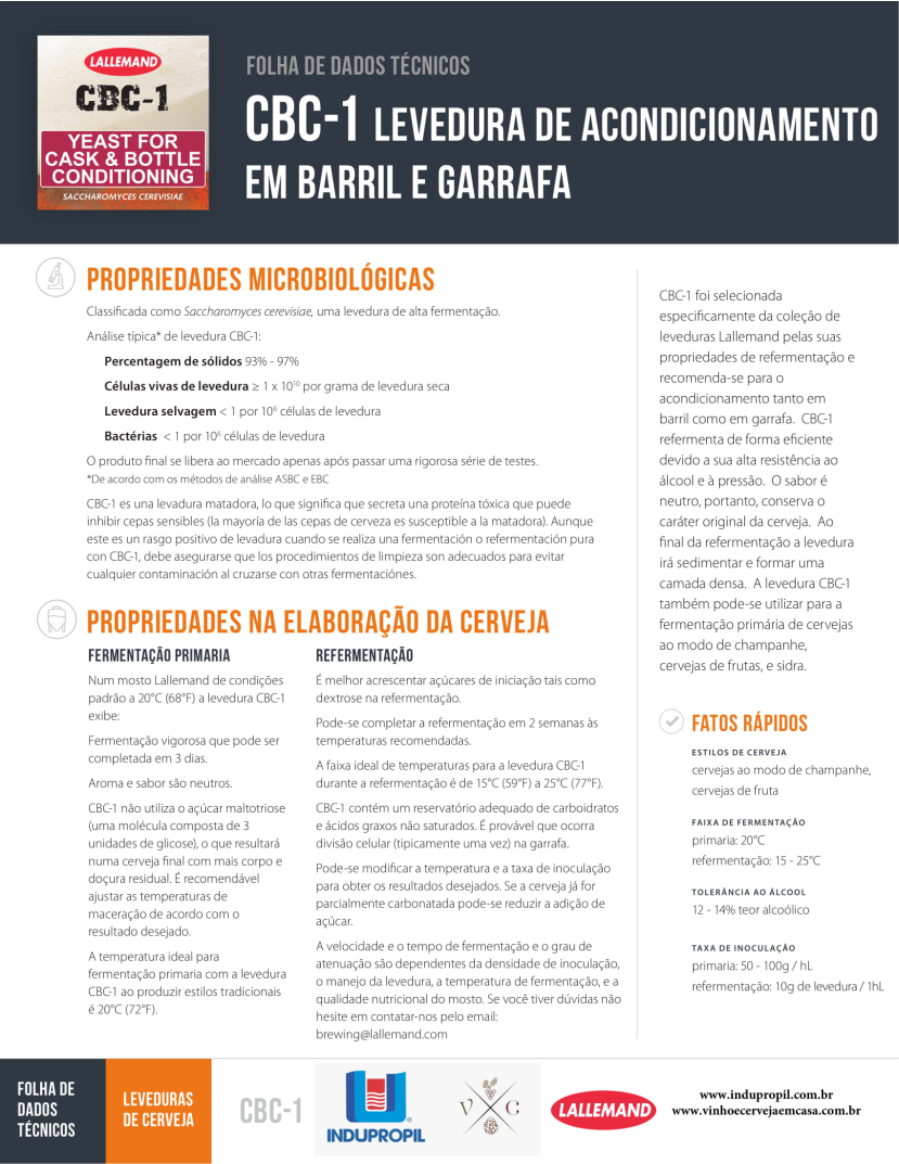 CBC-1 foi selecionada especificamente da coleção deleveduras Lallemand pelas suas propriedades de refermentação e recomenda-se para o acondicionamento tanto em barril como em garrafa. CBC-1 refermenta de forma eficiente devido a sua alta resistência aoálcool e à pressão. O sabor éneutro, portanto, conserva o caráter original da cerveja.